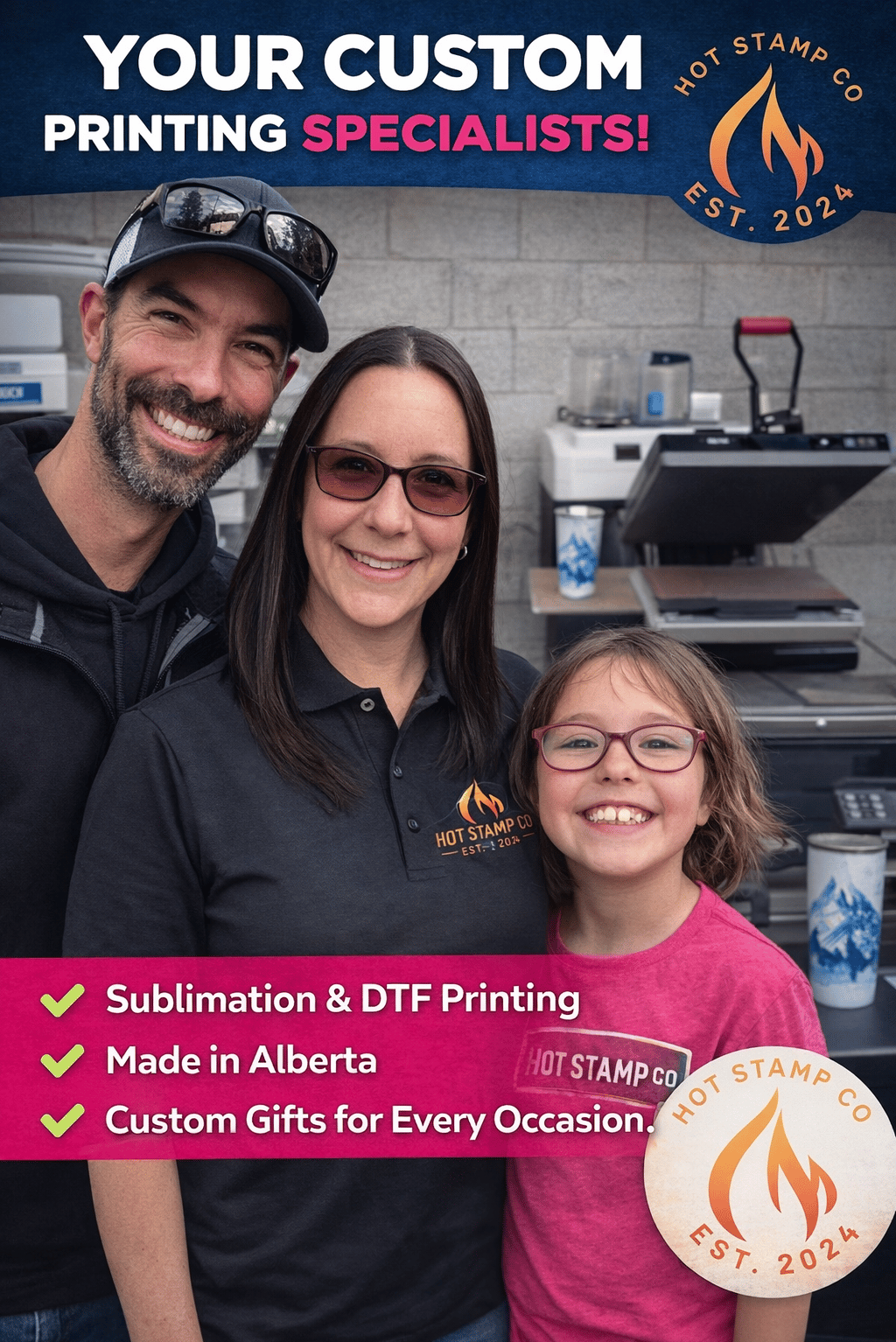 Hot Stamp Co. started as a small home based business based in Wildwood, Alberta, as a creative outlet. Initially, started by Chris Shea, Rachel Shea quickly joined in. As we started to grow, we have been involved in the community that we are a part of. It soon became obvious that we had tapped in our creativity that had once been forgotten. We have been fortunate enough to be part of some solutions for clients big and small and hope to continue to do so in the future.